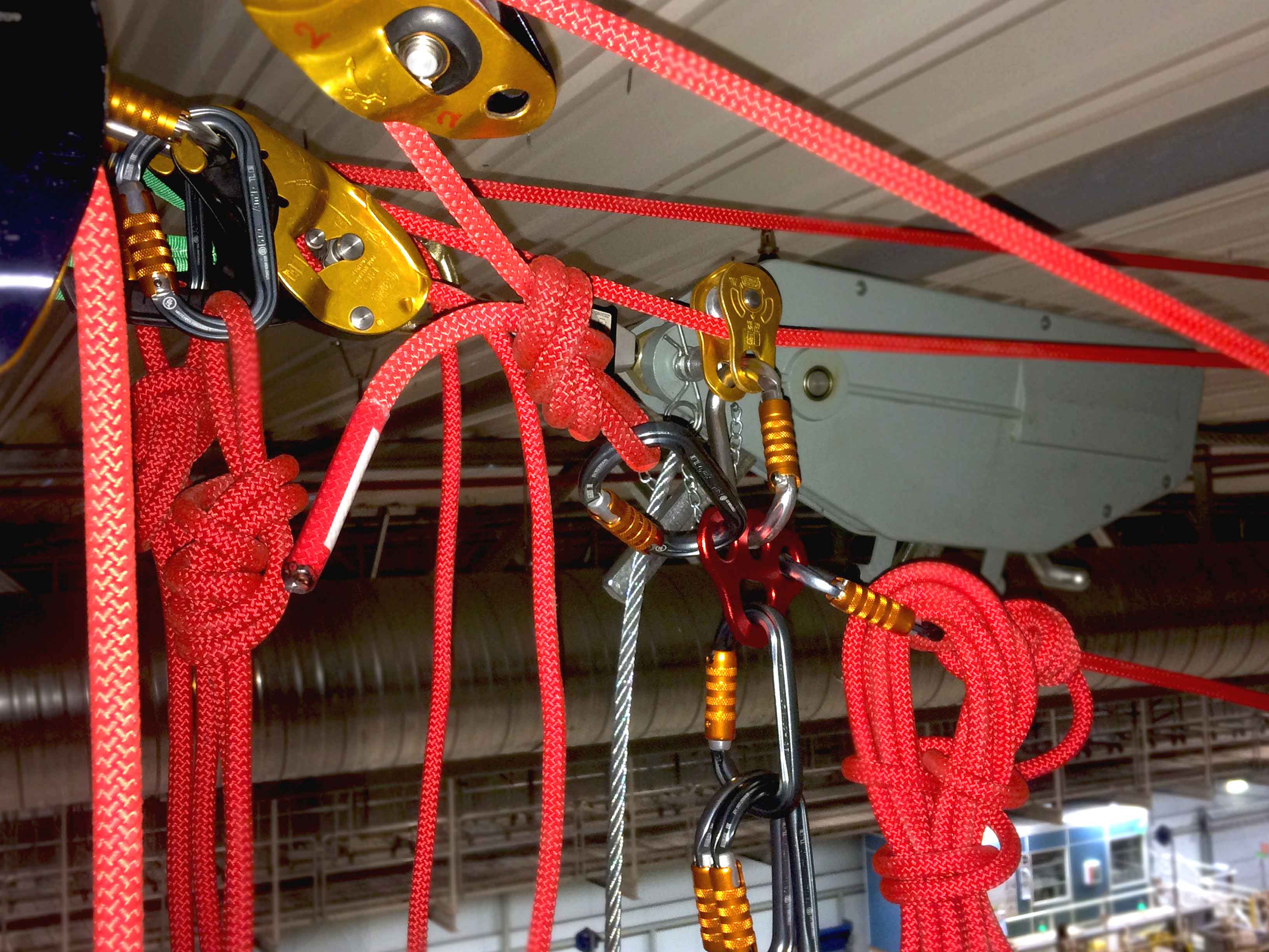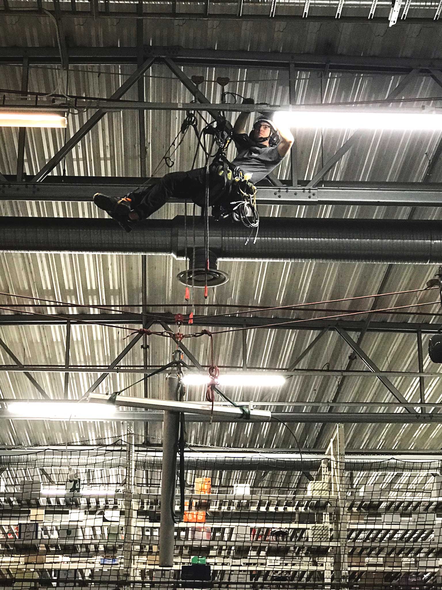 I lagrets tak behövde ett hundratal armaturer bytas ut till LED och en kabel för styrning installeras. Idén att utföra uppdraget via rep väcktes efter en mässa där uppdragsgivaren först träffat oss och fått upp ögonen för reparbete.