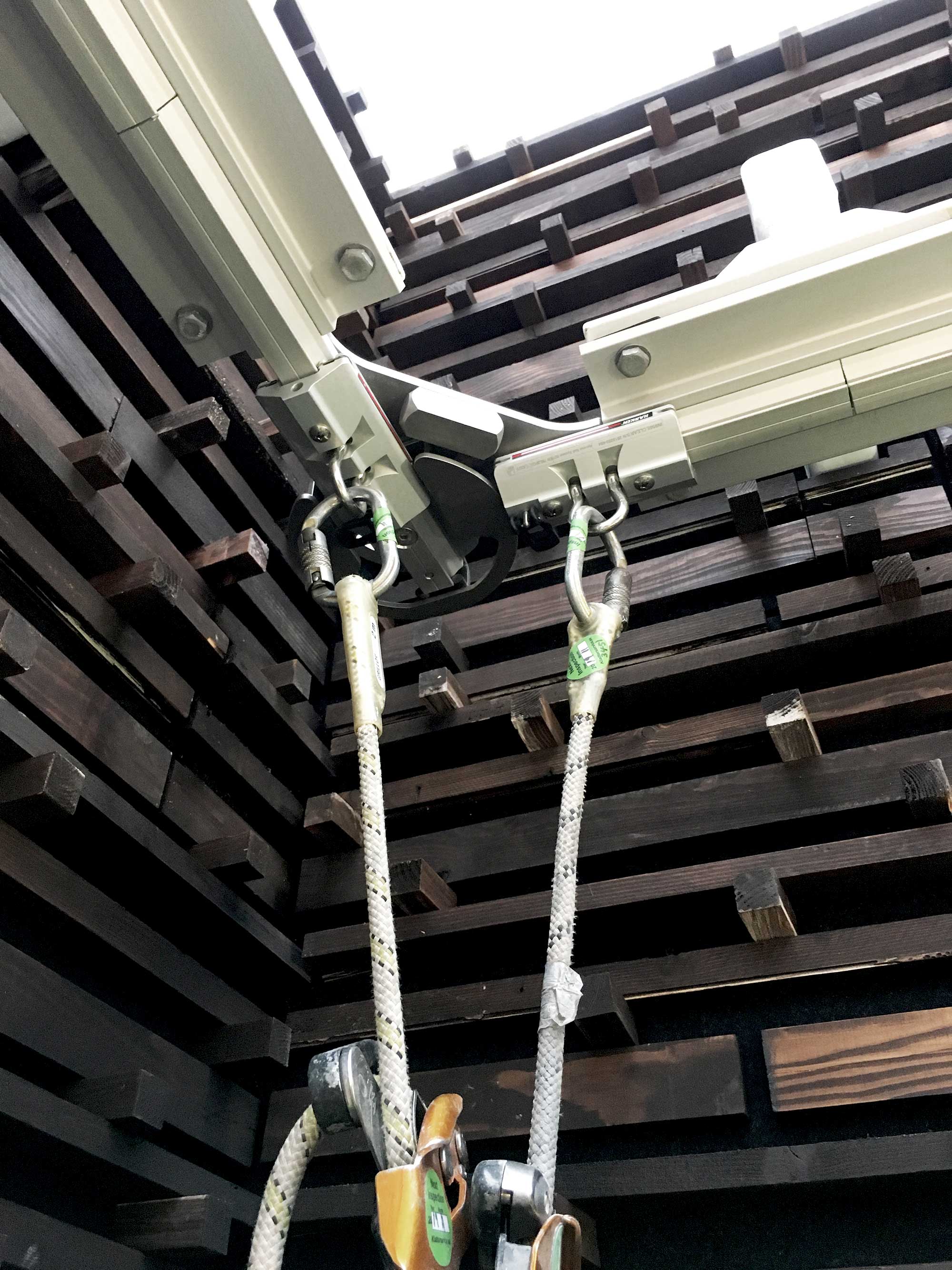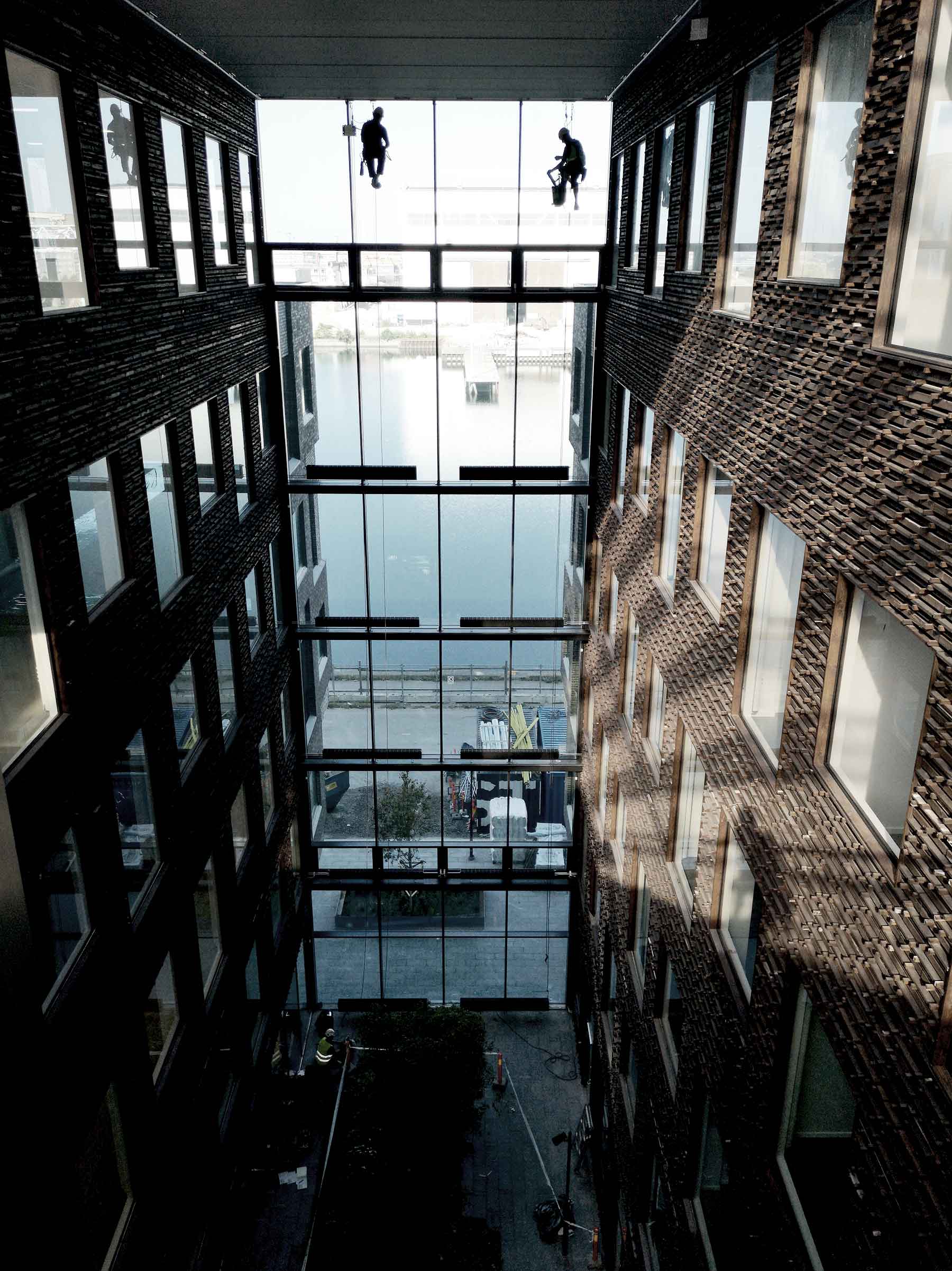 Tanken om lift skrotades till fördel för ett system som tidigare varit okänt för beställaren. Vårt uppdrag blev att planera och installera ett komplett system där reparbetare kan koppla på sig i en punkt och därifrån få åtkomst till atriets 8 fasader för fönsterputsning, högstädning och underhållsarbete.