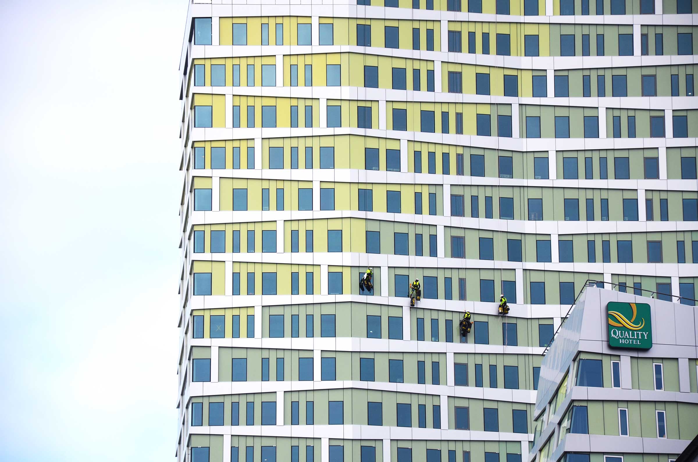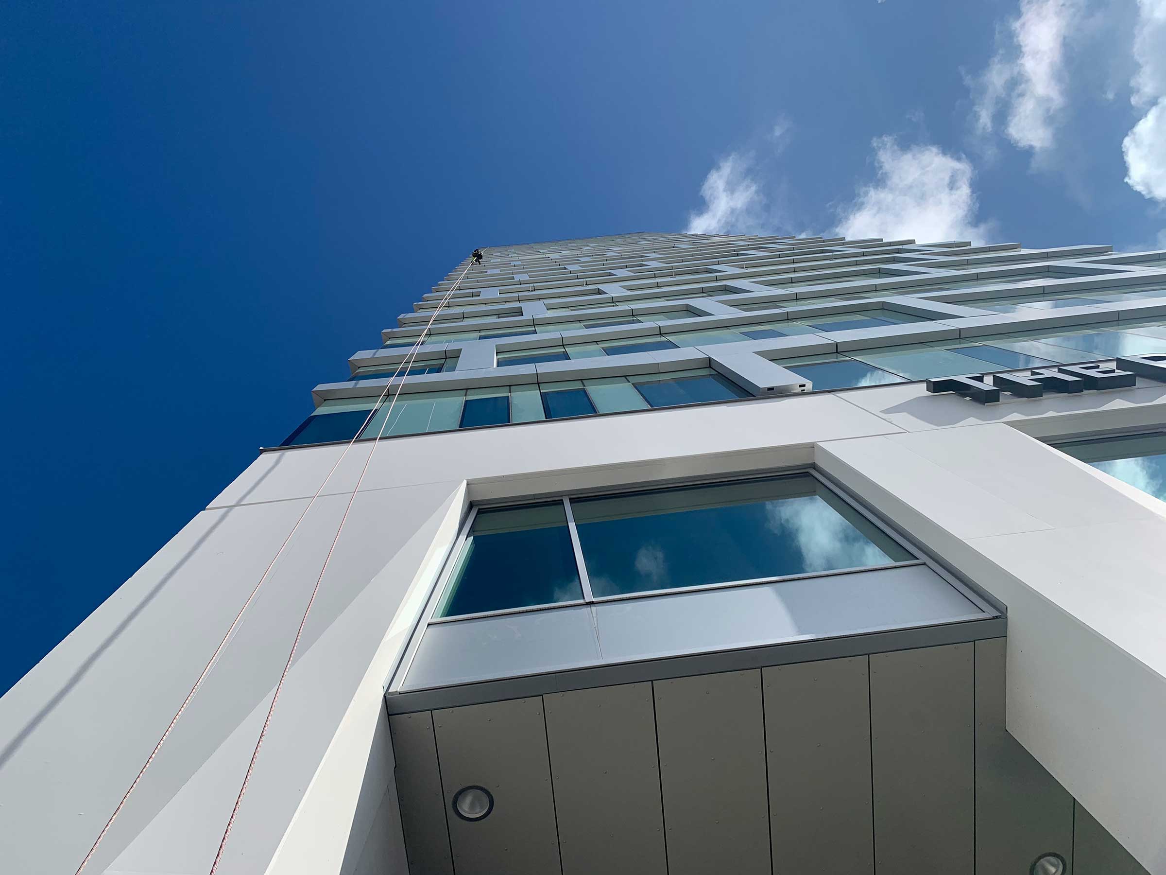 Fönsterputsningen var flexibel att utföra från rep och blev starten på en serie andra mindre arbeten från rep över fasaden. Återkommande uppdrag har bland annat varit montering av solfilm, plåtarbeten, glasbyten och tätning efter behov.